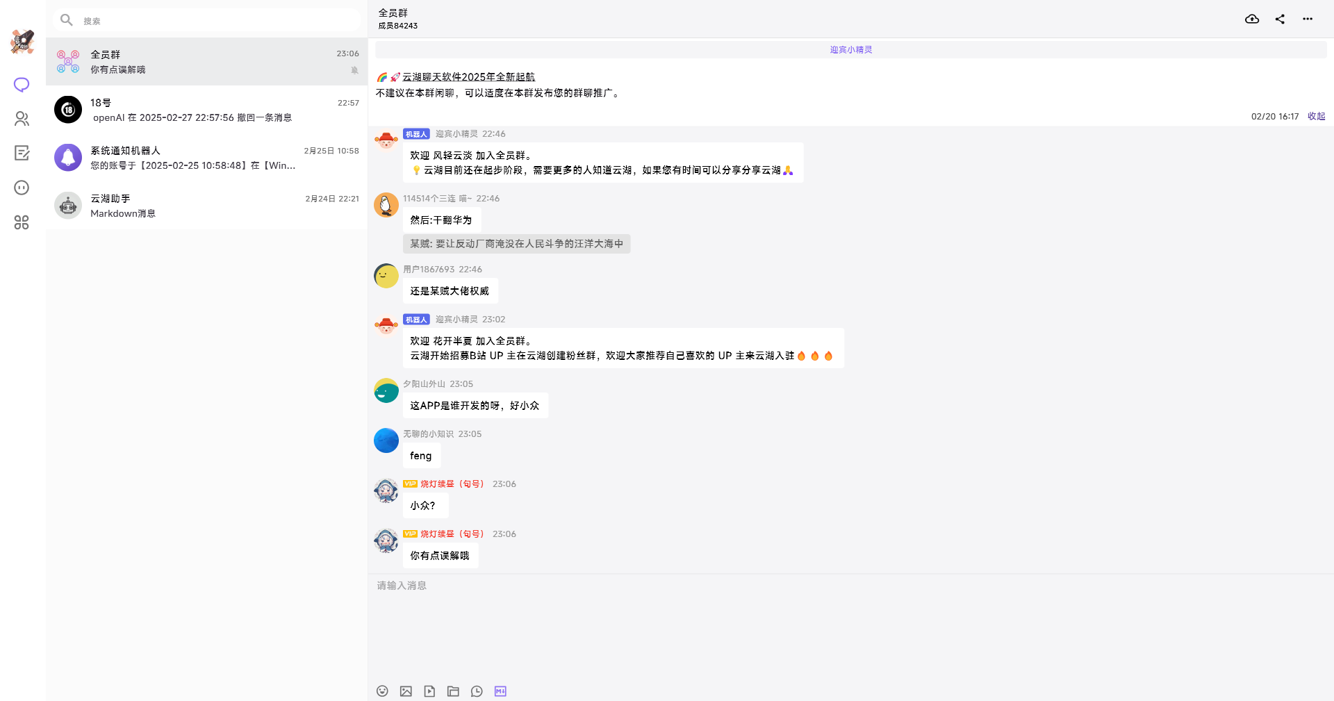 补充:有人维护,用户反馈一直听得见,更新不是“修复了一些bug”语音有进度条撤回不限时间消息发送后可以重新编辑软件启动半秒解决开发者不定时上线无主动广告无购买会员推送无更新弹窗/强制更新界面简洁电脑版无需扫码登录有网页版:chat.yhchat.com(7天连续在线+申请内测用户特权)所有用户可以发文章表情包实时更新(制作者添加表情,使用者同步添加表情)社区环境高质量webdav挂载到群云盘支持语音视频通话(7天连续在线+申请内测用户特权)文件永不过期